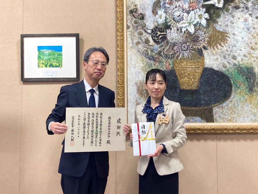 ホクタテは、被災地での救援活動や復興支援に役立てていただきたいとの思いから、富山県へ500万円、石川県へ500万円のお見舞金を寄附いたしました。